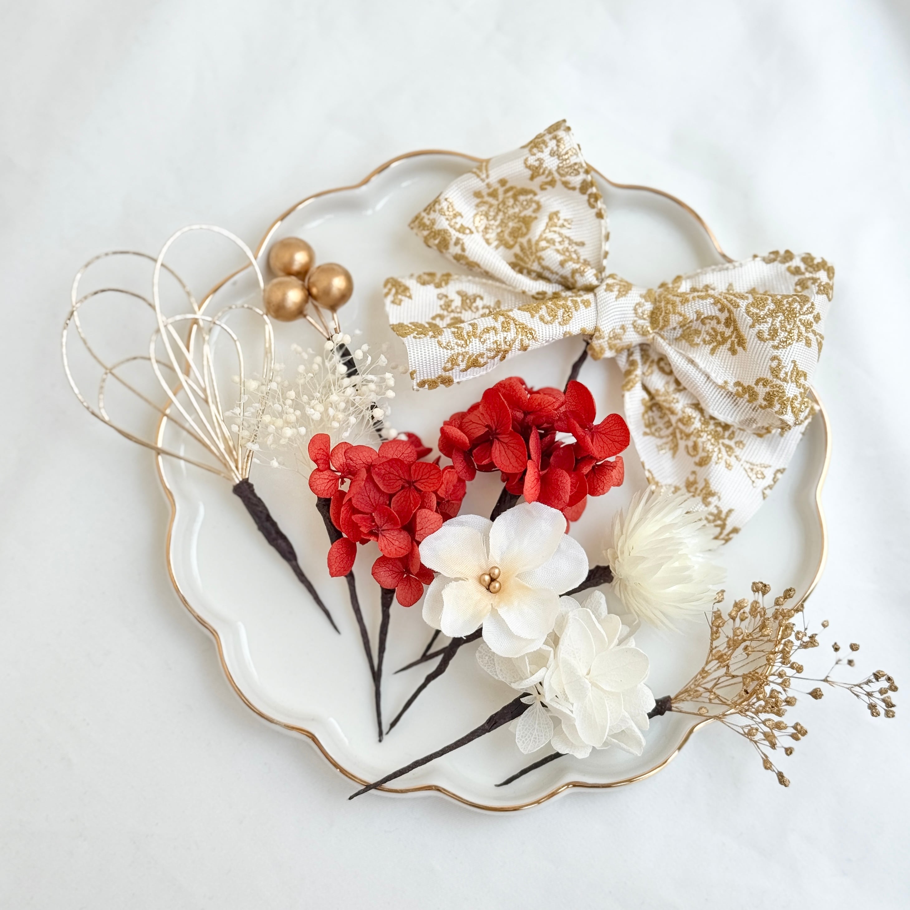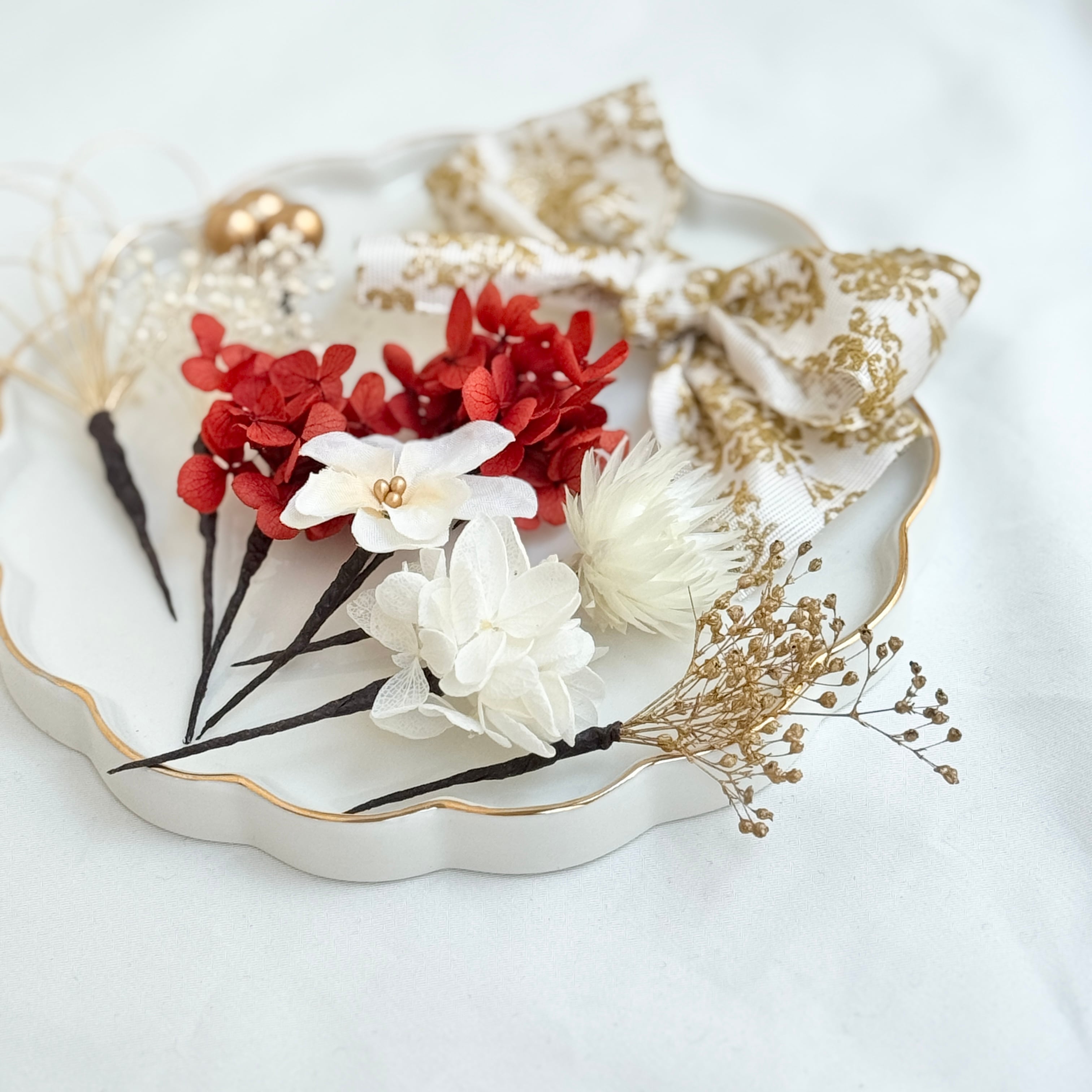 お団子にも、ツインヘアなどにもお使い頂けるよう、一本一本違う場所につけてアレンジ頂きやすいパーツになっている髪飾りです。