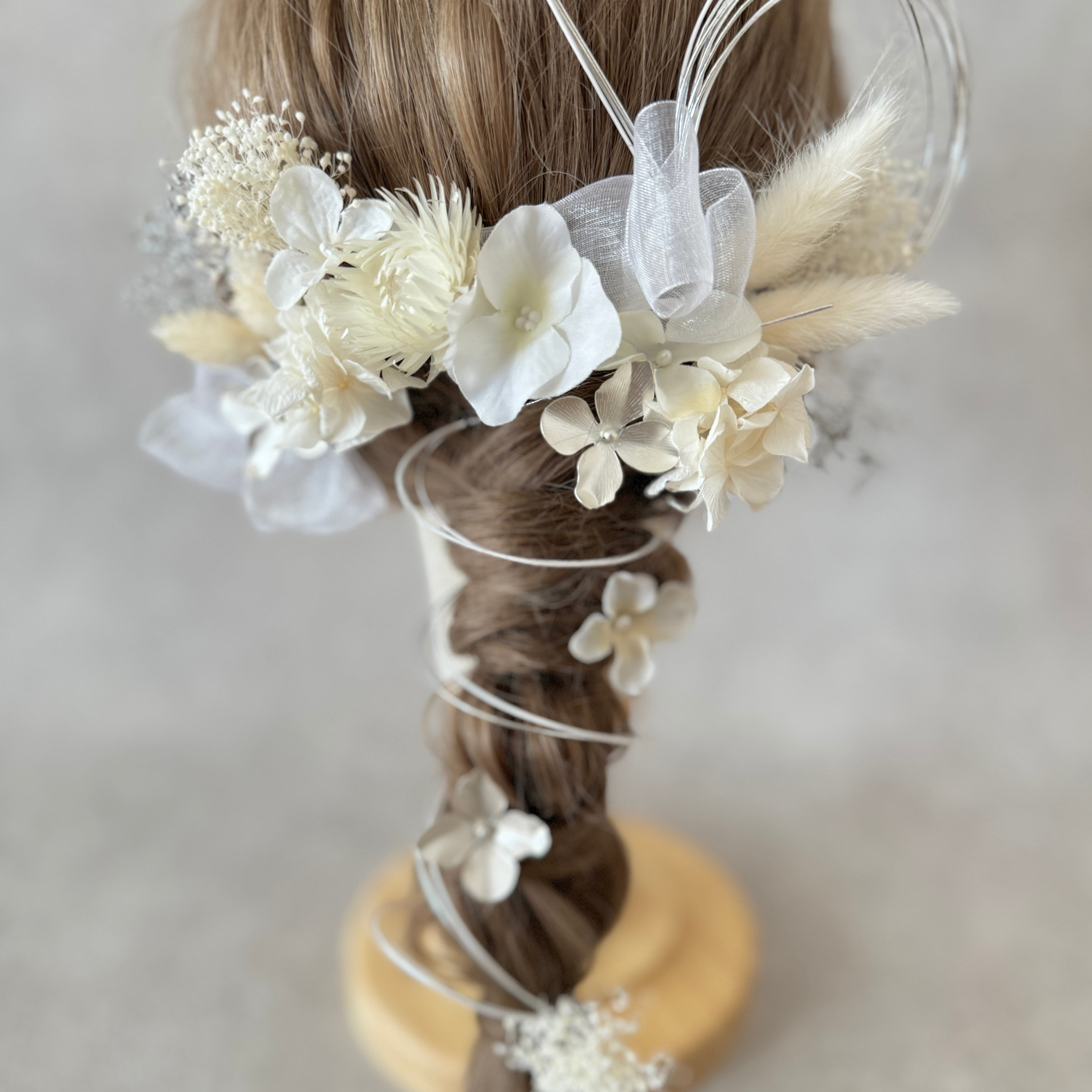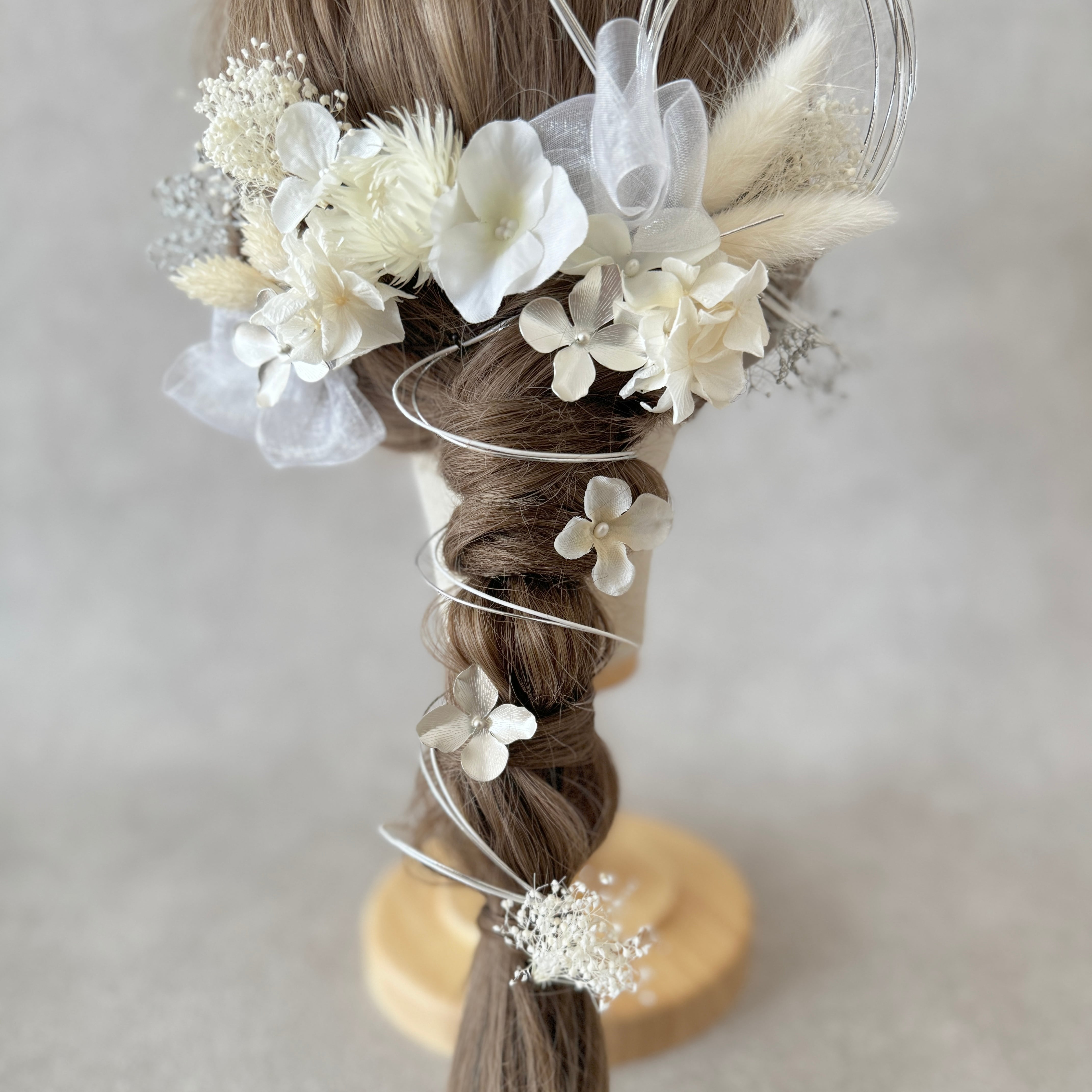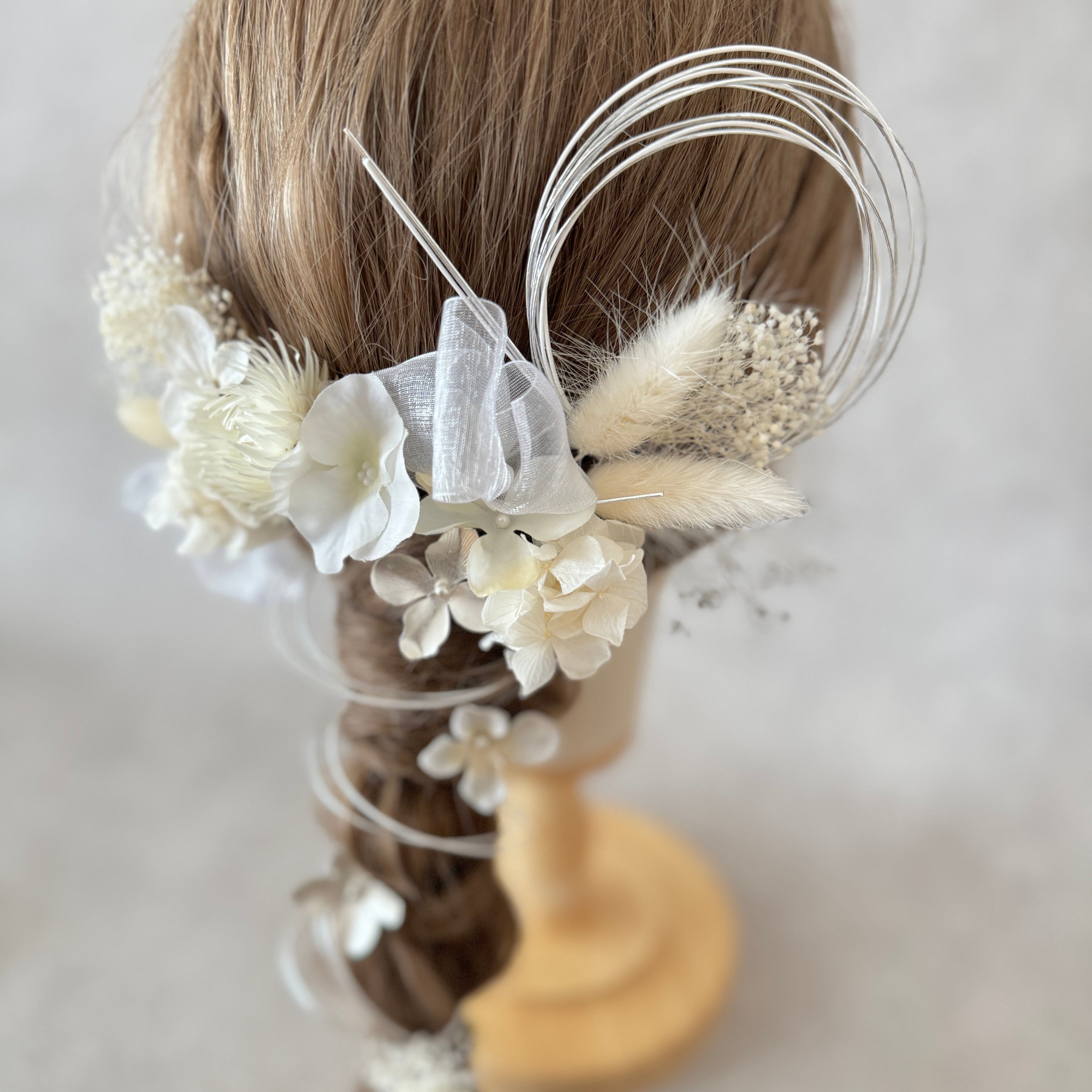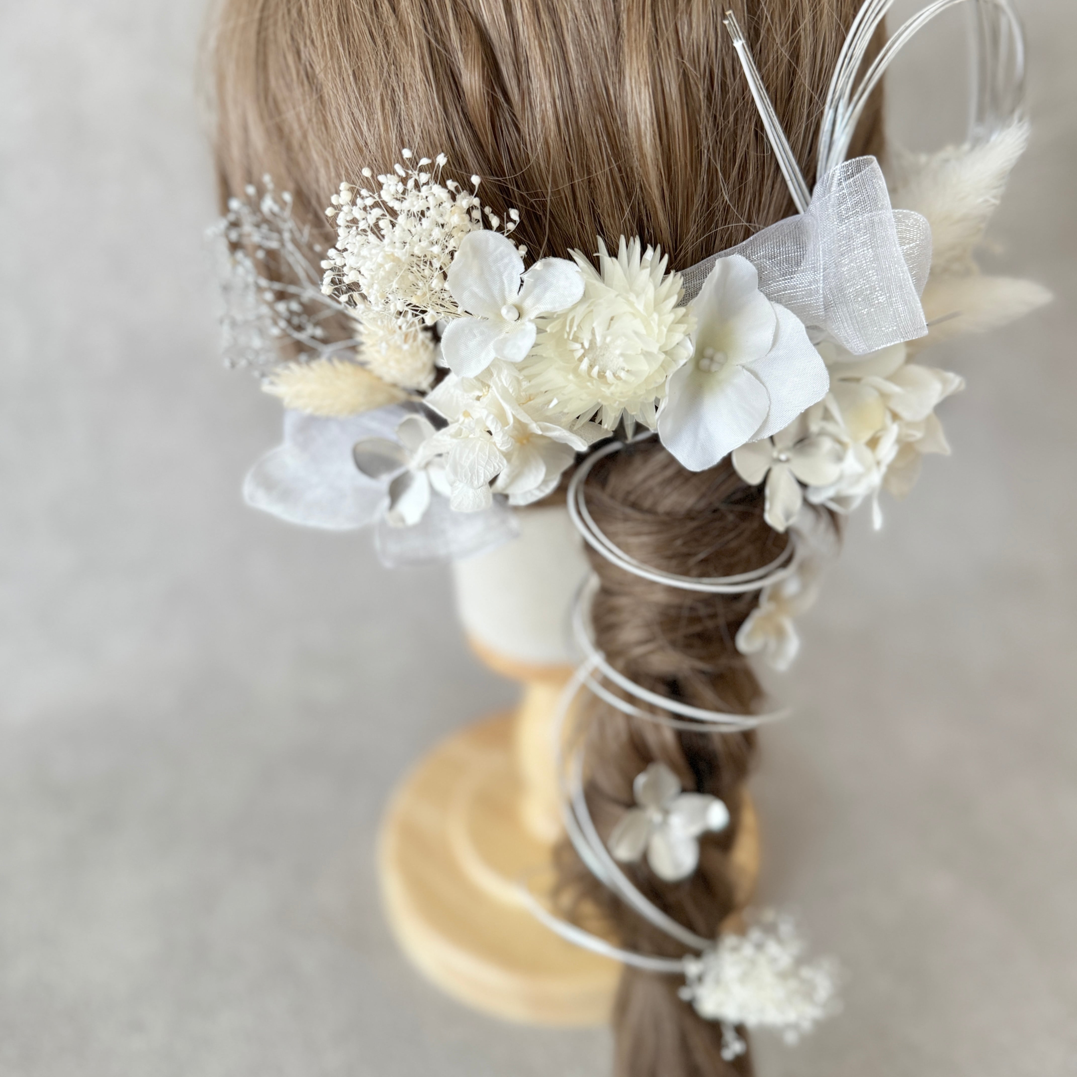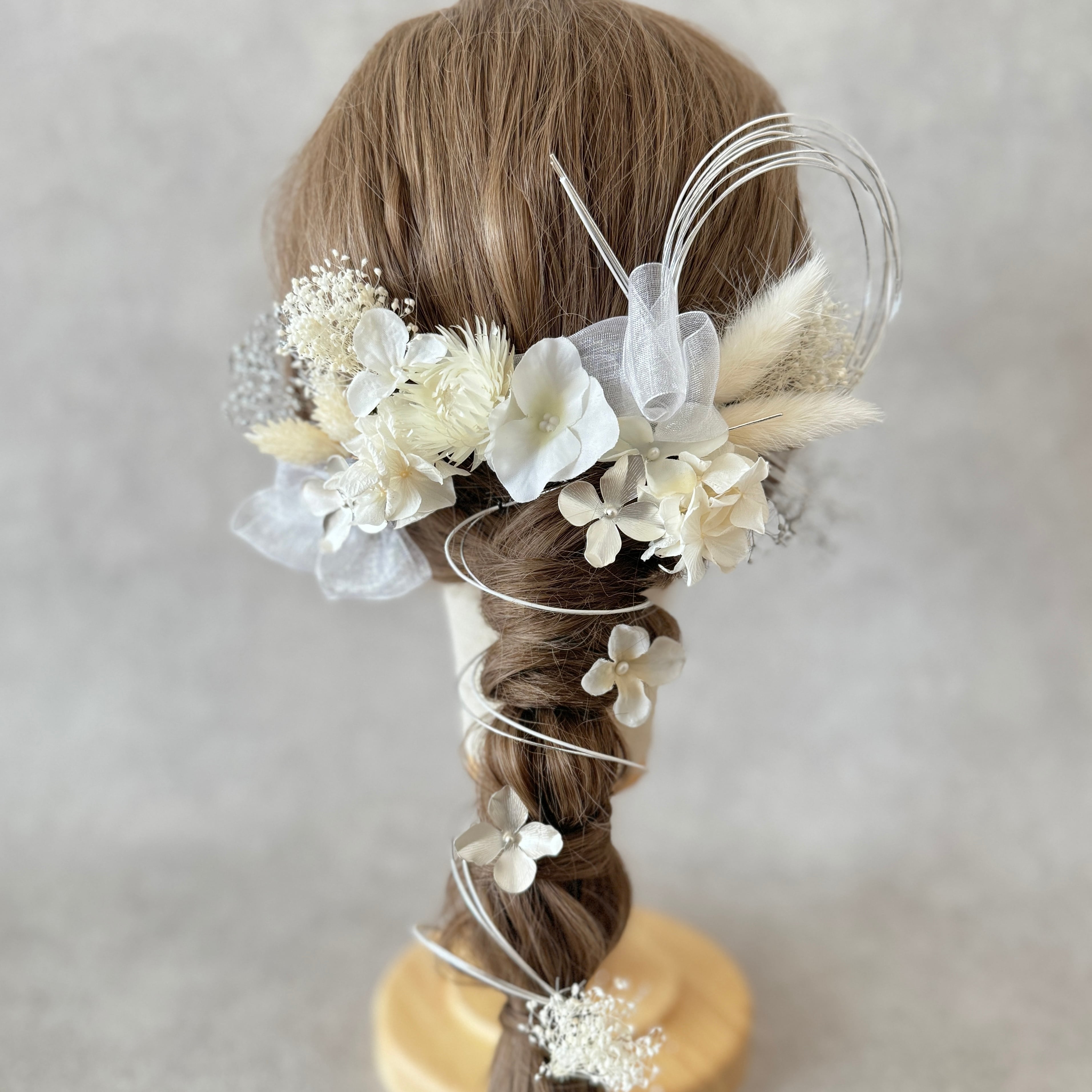 白×シルバーの髪飾り✲ 成人式髪飾り 卒業式髪飾り 結婚式 ブライダル ウェディング ヘッドパーツ ヘッドドレス ドライフラワー髪飾り ヘアアクセサリー 和装 振袖 袴髪飾り