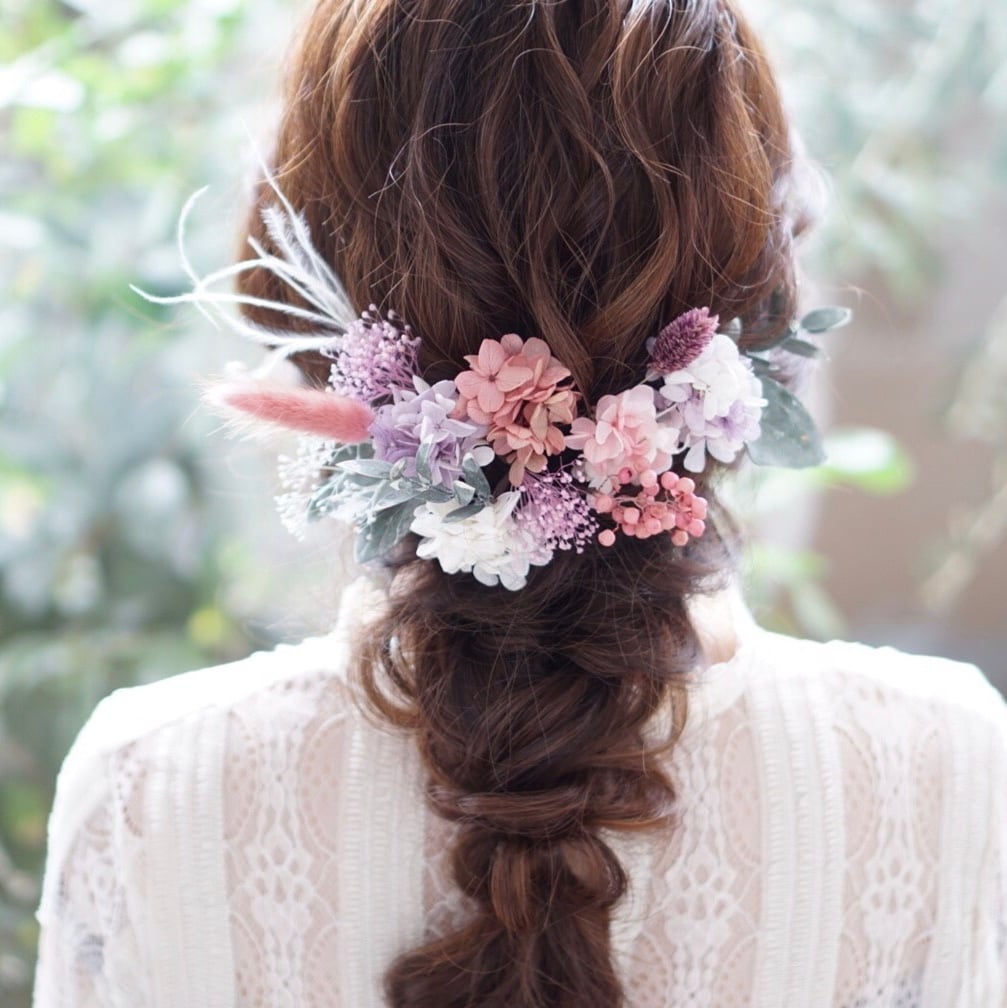シックで大人可愛いピンク×パープルのヘッドドレス ✲ ウェディング ブライダル 結婚式 卒業式 成人式 着物 袴 髪飾り ヘアパーツ ラプンツェルヘア ドライフラワー ユーカリ かすみ草