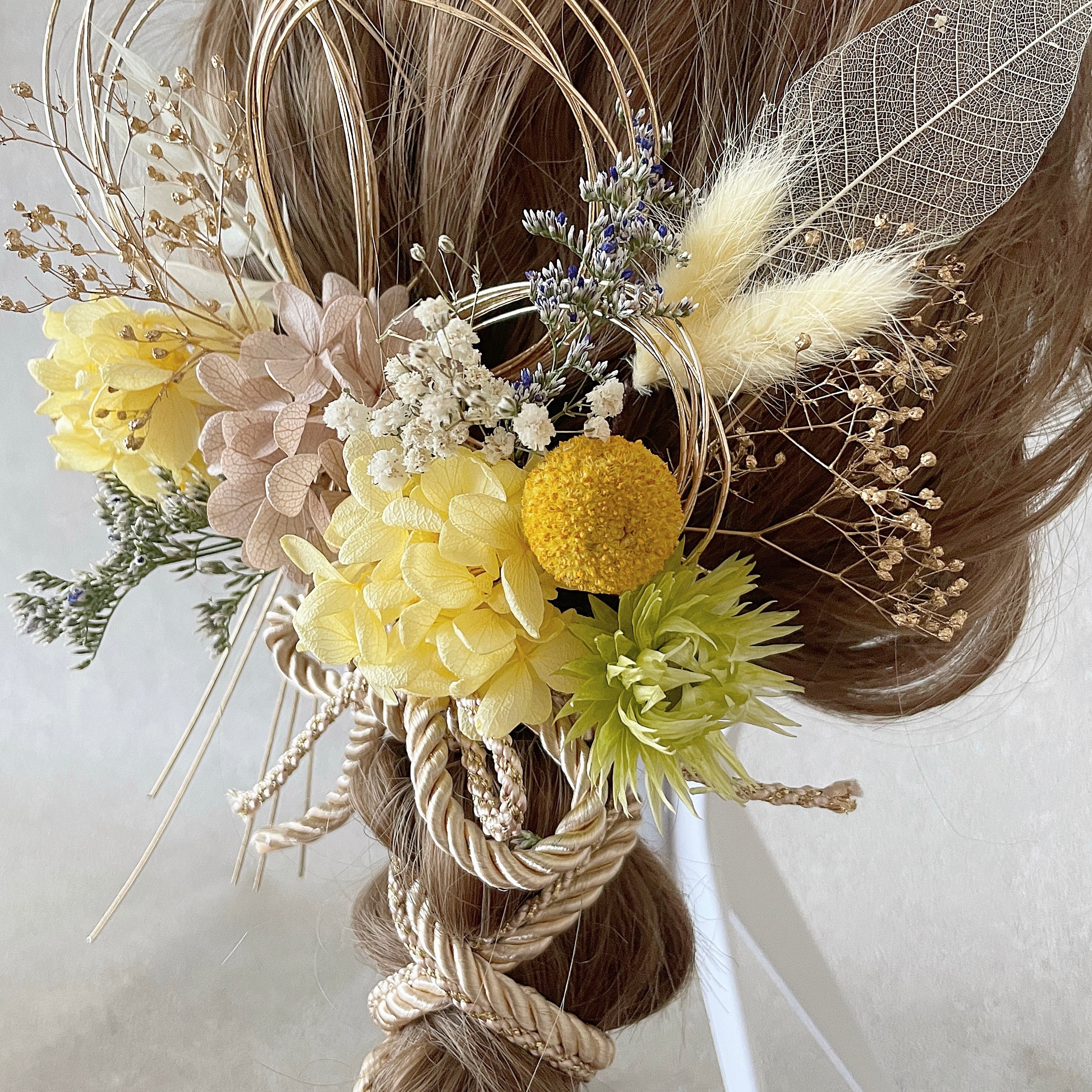金箔追加可能◎ナチュラルイエローとシャンパンゴールドのドライフラワーの水引ヘッドドレス✲ /ウェディング 卒業式 成人式 振袖 着物 袴 髪飾り ヘアパーツ プリザーブドフラワー お洒落 紫陽花 黄色 緑