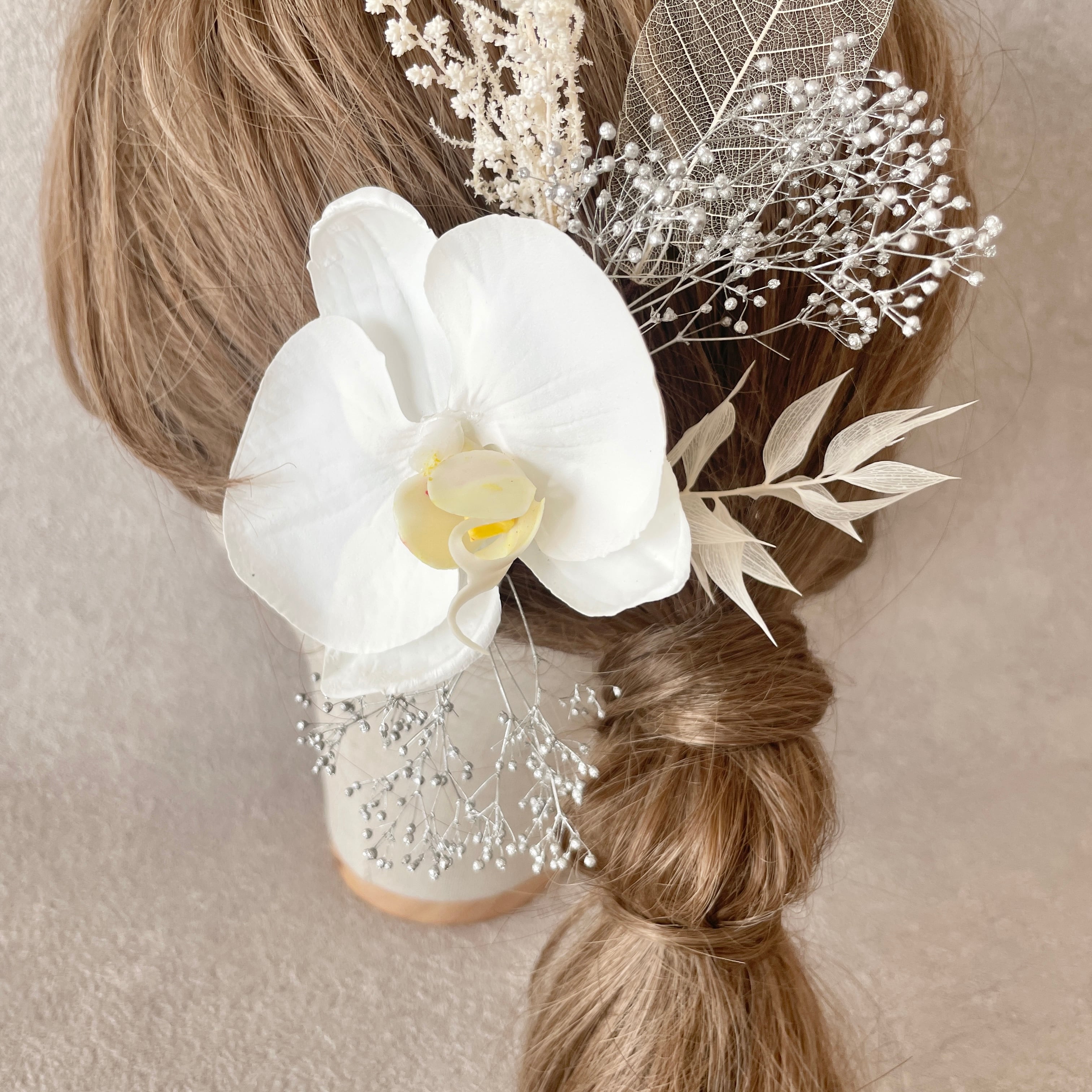凛とした胡蝶蘭のホワイトシルバーの髪飾り✲ /ウェディング 卒業式 成人式 振袖 着物 袴 白無垢 髪飾り ヘアパーツ プリザーブドフラワー お洒落